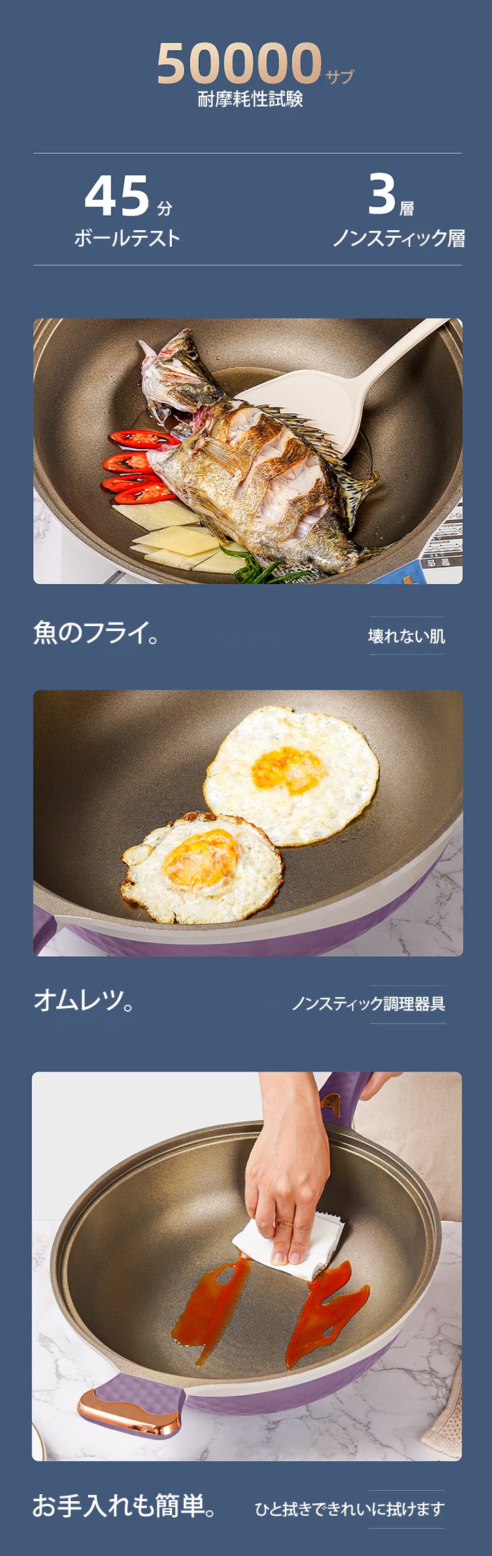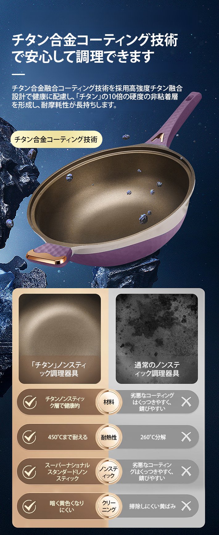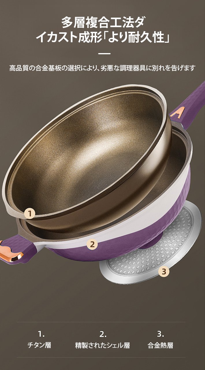 ツートンカラーのチタンテフロン加工中華鍋は、優れた耐久性と調理能力を備えています。今すぐ購入して、プロのシェフのような調理結果を手に入れましょう!